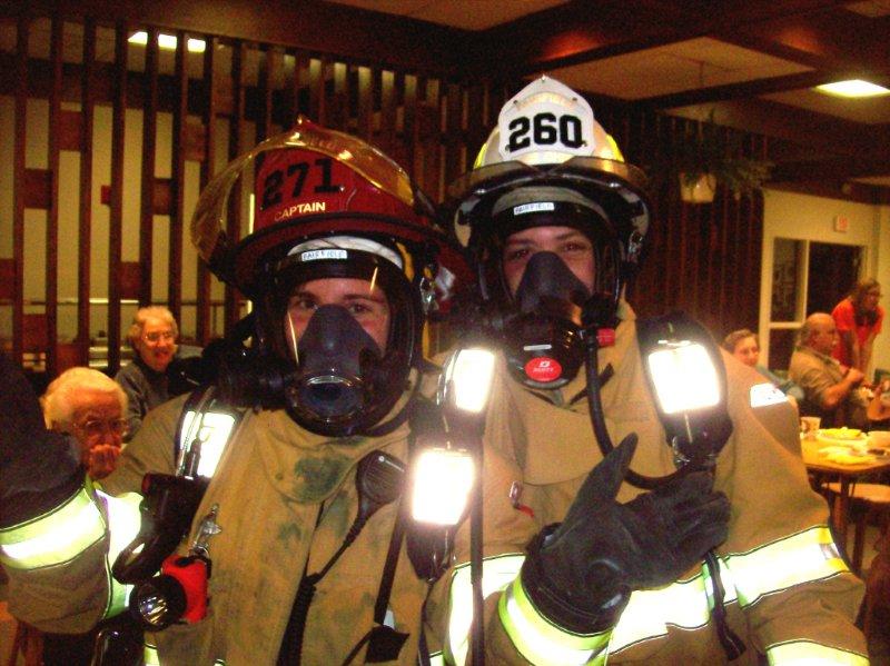 Every year the Sisters have a dinner to thank the local volunteer fire department. It took place Monday night and the dinner concluded with the fire chief asking for two able bodied people to come up and put on the uniform. The entire dining room looked at Carrie and I. And when I tried the excuse, "I'm on dishes tonight", it didn't quite work. So up we went, and attempted to race each other into the uniform.